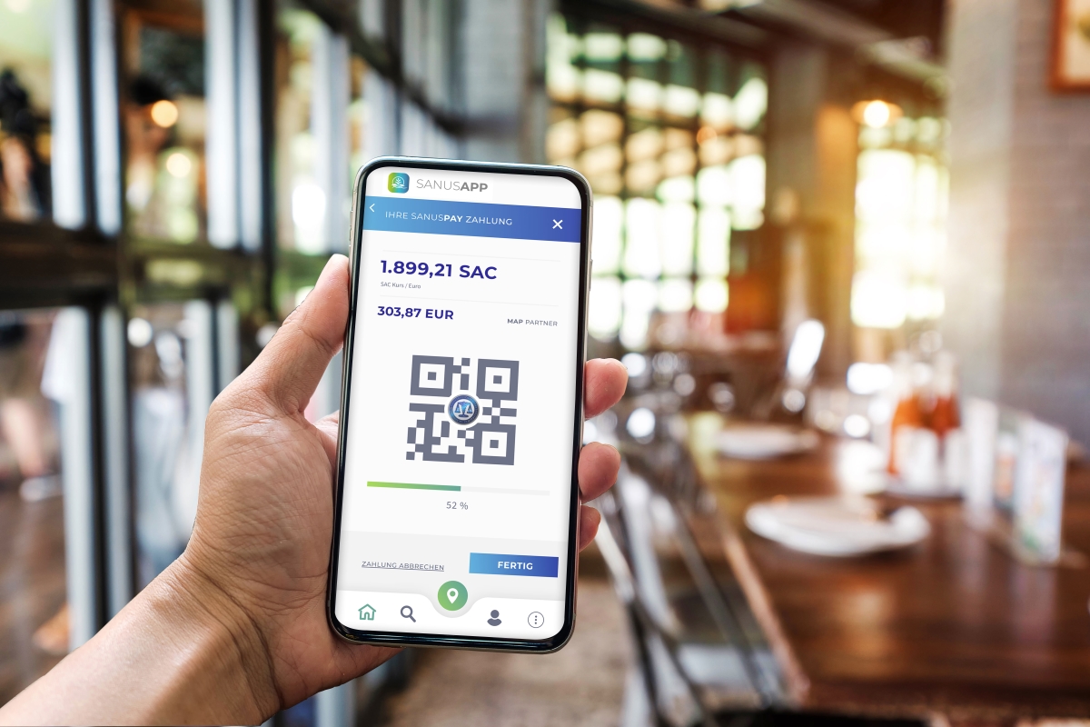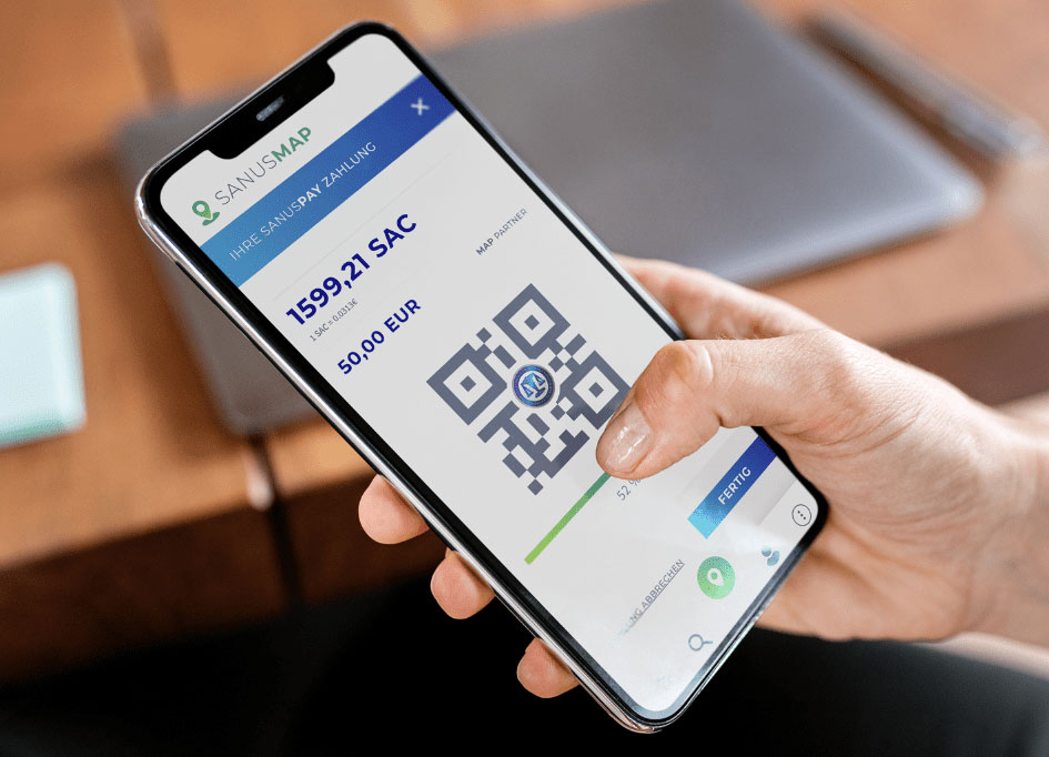 Der Kunde öffnet die App auf seinem Smartphone, klickt auf „SANUSCOINS senden“ und scannt den statischen QR-Code, der im Kassenbereich über ein digitales Gerät angezeigt wird. Nun musst du nur noch den Betrag eingeben (Euro bzw. in seiner Landeswährung) und den Vorgang bestätigen. Fertig!